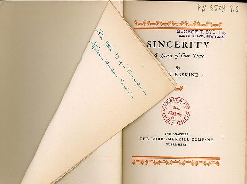 John Erskine (1879-1951) enseigne la littérature de 1909 à 1937 à l'université de Columbia (New York). En 1919, il est nommé directeur de l'Université militaire américaine créée à Beaune. Après le départ du contingent américain, la bibliothèque de cette université est dispersée et une partie des ouvrages donnée à la ville de Beaune. Dans les années 1950, des dons en provenance des États-Unis, en hommage à J. Erskine, permettent l'installation de la bibliothèque Erskine, reçue par la bibliothèque universitaire de Dijon en 1954. Elle est conservée dans le magasin de la BU Droit-Lettres. Ses ouvrages sont majoritairement en langue anglaise et portent sur des thèmes variés : littérature, religion chrétienne, sciences sociales, histoire, sciences... livres pour enfant.