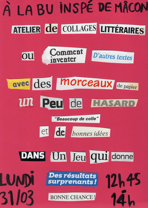 À l’occasion de la 27ᵉ édition du Printemps des poètes, nous vous invitons donc à laisser s’exprimer votre créativité lors d’un atelier de collages littéraires à la BU INSPÉ de Mâcon, le 31 mars 2025, de 12 h 45 à 14 h. Si vos œuvres vous plaisent, vous pourrez les afficher sur nos grilles d’exposition ! De la colle, des paires de ciseaux, des feuilles A4 et un répertoire de mots découpés seront fournis.