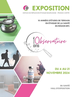 L’Espace de Réflexion Éthique Bourgogne - Franche-Comté (EREBFC) fête en 2024 les 10 ans d'études de sa misson Observatoire ! L'exposition reprend les diverses études menées par l’observatoire depuis 2014 : Éthique et vieillissement, Étude sur les instances éthiques locales, Éthique et maladies neuro-évolutives, Éthique et psychiatrie, Éthique et migrants, Éthique et vaccination à la covid19 et Éthique et engagement des médecins du service public.