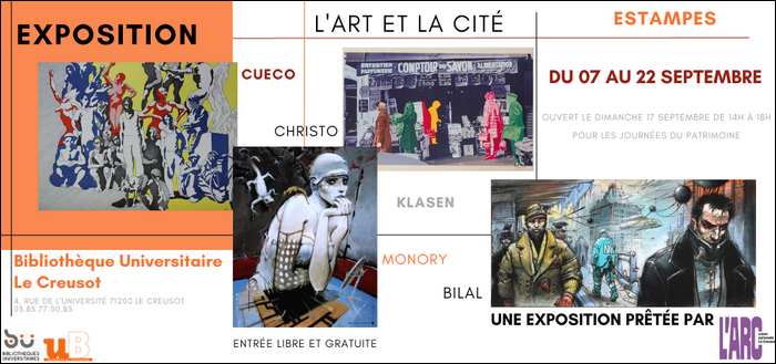 À travers une sélection d'œuvres provenant du fonds d'estampes de l'Arc - Scène Nationale Le Creusot, la BU Le Creusot propose aux visiteurs un parcours dans l'espace de la cité, vue par des grands noms des arts visuels de 1960 à 1990. Cette exposition, ainsi que le bâtiment historique de la bibliothèque, seront également visibles lors des journées du patrimoine.