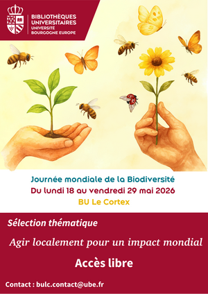 Sélection proposée sur le thème de la Journée mondiale de la Biodiversité qui a lieu le 22 mai. Des livres seront présentés sur la thématique 2026 « Agir localement pour un impact mondial » et une sélection de livres et articles numériques seront mis en valeur sur la dalle.