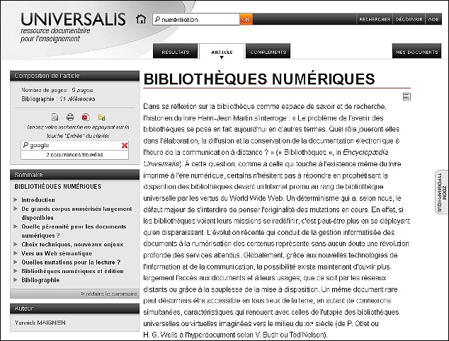 Si vous tapez Numérisation dans la fenêtre de recherche, vous vous verrez proposer de nombreux articles indexés avec ce mot-clé, parmi lesquels Bibliothèques numériques et Edition électronique semblent pouvoir fournir une information intéressante pour bâtir un historique expliquant la situation actuelle. Dans le premier article, le site GoogleBooks est mentionné.