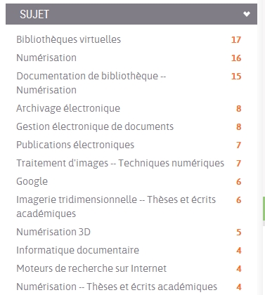 Pour affiner la recherche, utilisez les facettes dont les plus utiles sont Sujet et Langue.