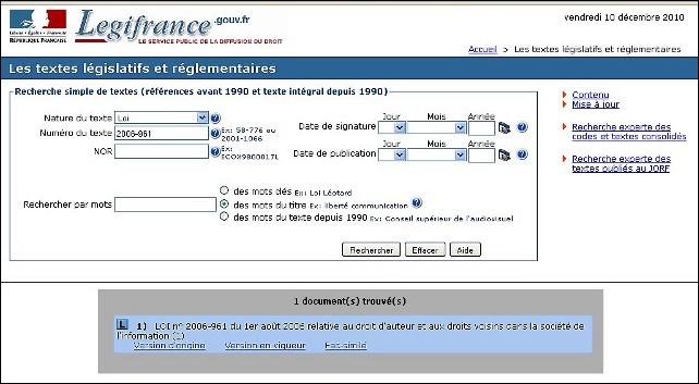 Il faudra se méfier des sobriquets courants qui désignent les lois dans le style journalistique : loi "Hadopi", loi "Création et Internet" loi DADVSI ; souvent ils ne sont pas reconnus par les sites juridiques : il vaut mieux interroger par le numéro du texte ou sa date de promulgation couplée avec sa nature juridique, ou par des termes choisis dans le titre officiel. L'encyclopédie Wikipédia offre souvent un moyen commode de passer de l'un à l'autre.