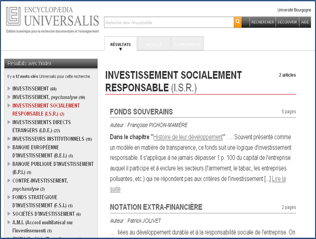 Entrer le terme « investissement socialement responsable » dans la fenêtre Rechercher de l’Encyclopédia Universalis et cliquer sur OK pour obtenir une première sélection d’articles.
