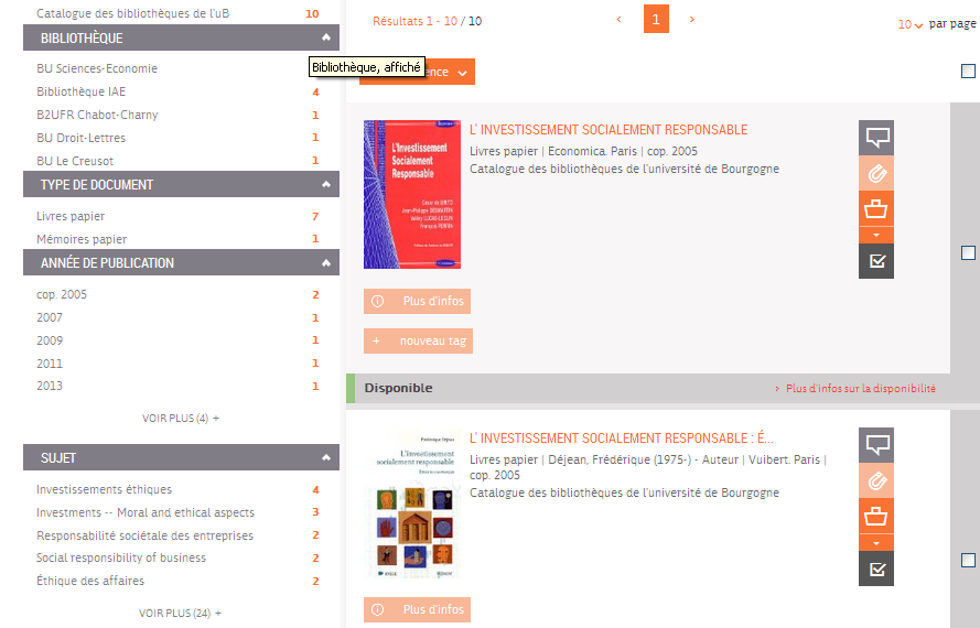 La recherche par mots du titre « investissement socialement responsable » sur le catalogue général du SCD ne renvoie que quelques résultats.