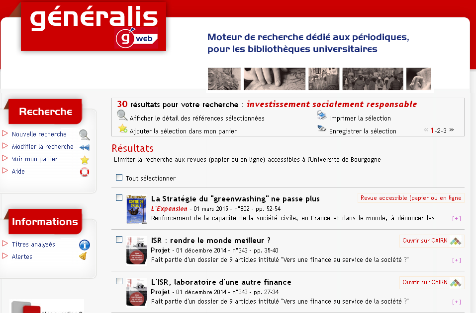 La recherche dans la base de données Généralis permet de compléter l’utilisation des ressources du SCD. En effet, une partie des résultats obtenus suite à la recherche par les mots clés investissement socialement responsable (sans guillemets), correspond à des articles publiés dans des revues auxquelles le SCD est abonné : un article de 2009 du Nouvel économiste sur la crédibilité de l’ISR intitulé Mouvement de fonds, un dossier d’Alternatives économiques sur la moralisation de l'économie, un article de Problèmes économiques sur l’engouement pour l’ISR en France.