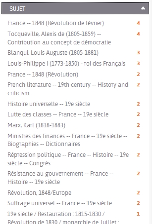 Vous pouvez ainsi limiter votre recherche. Au niveau des sujets, le lien VOIR PLUS vous permet de choisir par exemple : Résistance au gouvernement -- France -- Histoire -- 19e siècle.