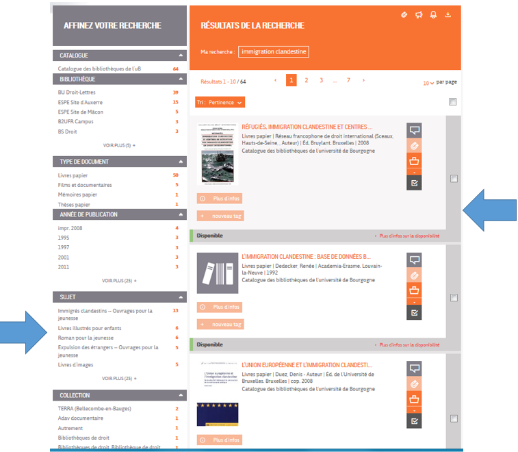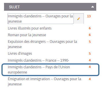 Pour affiner la recherche, utilisez les facettes, dont les plus utiles sont Sujet et Langue.