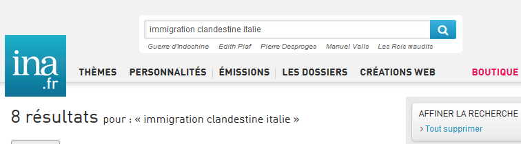 Toujours à partir de la page d’accueil de l’INA, cliquer sur Les sites de L'Ina pour les étudiants, les universitaires et les professionnels puis Collections, Catalogues des fonds audiovisuels, pour retrouver les émissions de radio et de télévision concernant l'immigration clandestine en Italie.