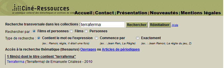 Dans la rubrique Recherche transversale dans les collections, saisir Terraferma dans la fenêtre de recherche et cocher la case Films.