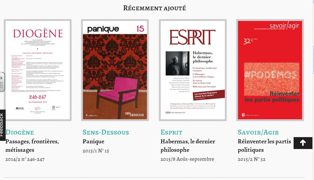 CAIRN contient par exemple des articles en texte intégral de revues spécialisées en philosophie. Vous pouvez ainsi feuilleter des revues ou des ouvrages ou bien faire une recherche d'articles en sélectionnant la revue qui vous intéresse. Utilisez dans ce cas la recherche avancée.