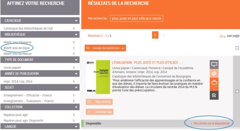 Filtre par bibliothèque : sélectionner INSPE site de Dijon, la notice abrégée du document L’évaluation, plus juste et plus efficace s'affiche, cliquez sur Plus d’infos sur la disponibilité pour consulter la cote du document.