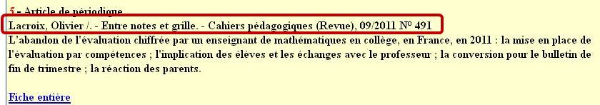 Le résultat de cette recherche se présente sous la forme d'une notice abrégée dans laquelle figurent : le nom de l'auteur, le titre de l'article, le nom de la revue, la date de parution et le numéro :