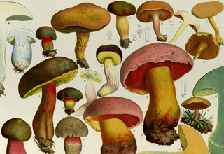 Krombholz, Julius Vincenz. Naturgetreue Abbildungen und Beschreibungen der essbaren, schädlichen und verdächtigen Schwämme. Prag : J. G. Calve. 1831-1846 École de médecine 329, Krombholz mykologische Hefte. Tafel 37. Boletus calopus, crassipes, sanguineus rhodoxanthus, piperatus. © Pôle documentation de l'Université de Bourgogne. Cote : École de médecine 329.